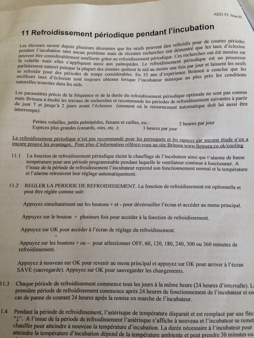 pas utile de régler la couveuse pour un refroidissement il suffit de sortir les oeufs 1/4 d'heure par jour pendant la dernière semaine (ou pas, ça marche aussi ....)
