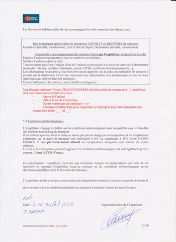 les animaux ne sont pris en transport que si l'expéditeur a pris connaissance du protocole et l'a signé